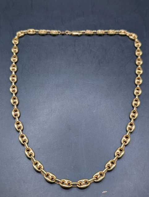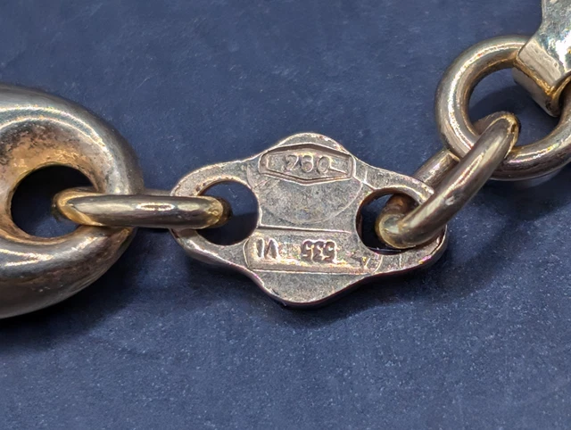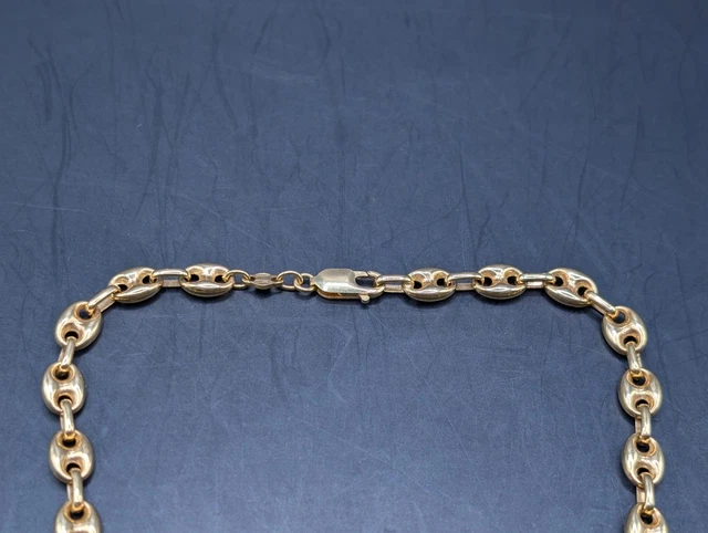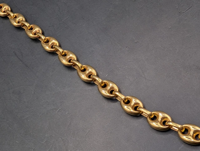 Voici un magnifique collier vintage en or massif 18 carats, à maillons marins et ancre. Ce collier est en excellent état et a été très bien conservé. Il est poinçonné « 750 » et porte les poinçons d’importation italiens. Ce collier est une pièce maîtresse qui ne manquera pas de susciter la conversation. Il a été testé avec une solution acide pour or 18 carats JSP et est garanti en or massif. Tous les maillons sont pleins, non creux.